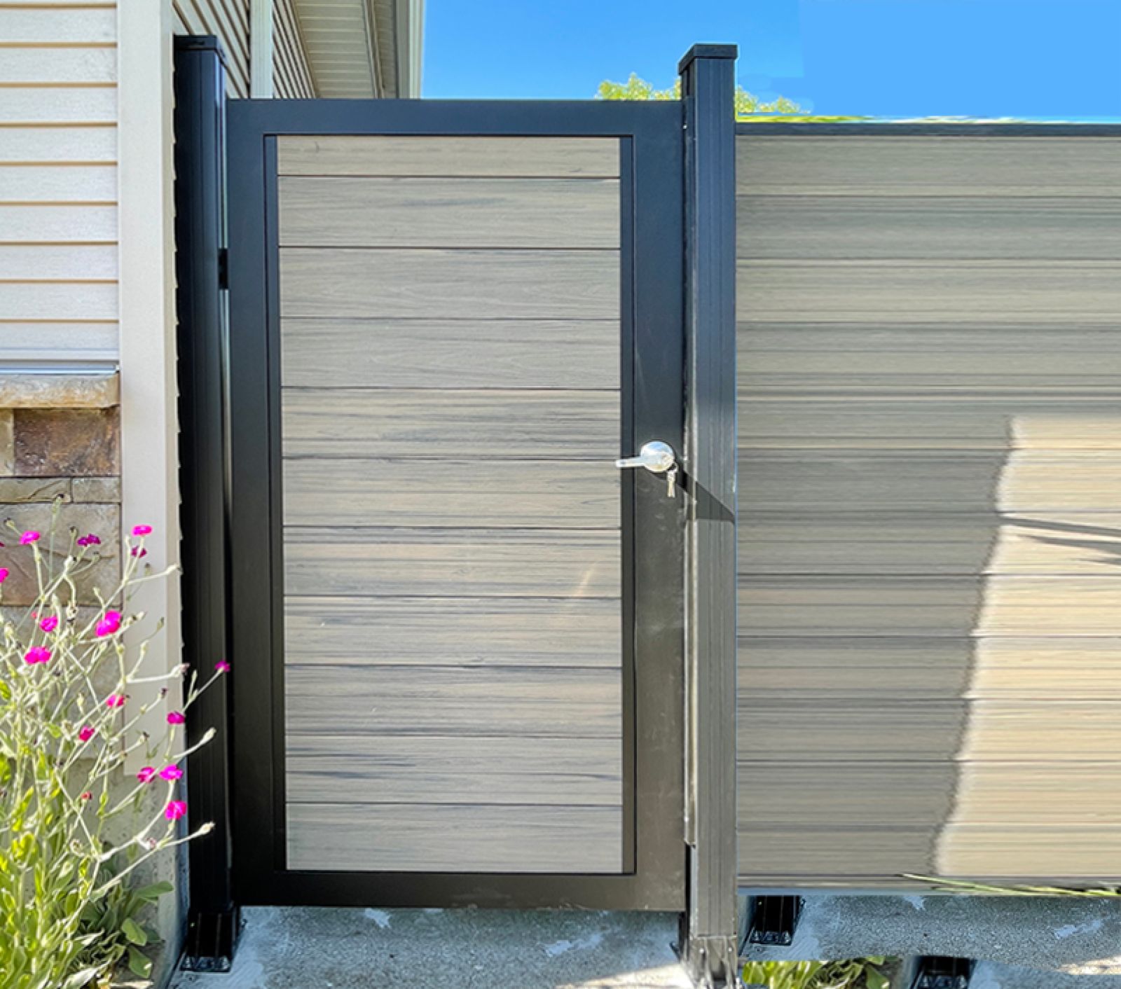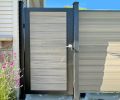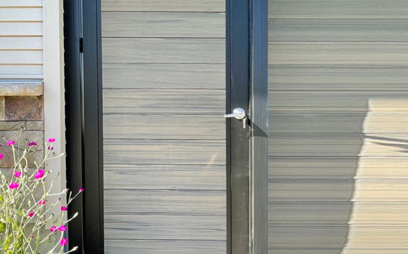 Composite pedestrian gates and aluminum gate options match DuraWood panels for a seamless entry.